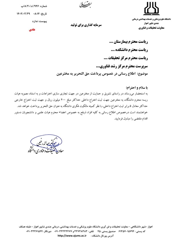 همچنین، برای ثبت اختراعات داخلی، دانشگاه مبلغی معادل حداکثر پنج برابر هزینه ثبت داخلی را به عنوان حقالتحریر در نظر گرفته است. این پرداختها تحت نظر کمیته مالکیت فکری دانشگاه انجام خواهد شد.